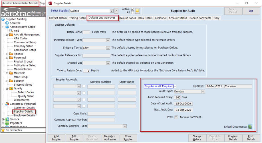 In the Administrator Module, navigate to Contacts & Personnel, Supplier Details and go to the "Defaults and Approvals" tab.