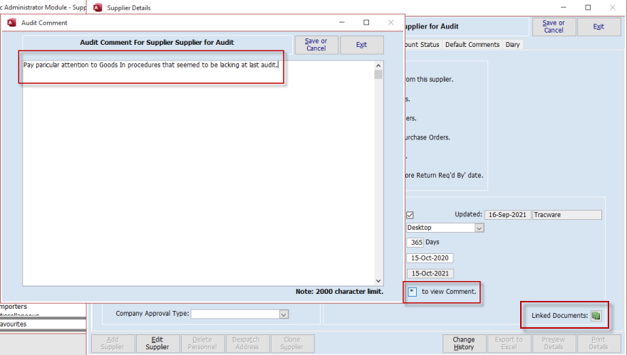 Comments can be added at a later stage while the Supplier Details screen is in edit mode.