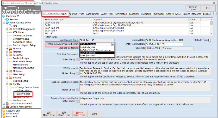 Edit the screen as required and select the appropriate "Continued Airworthiness Report" from the drop-down combo on the "A/C Maintenance Types" tab :-