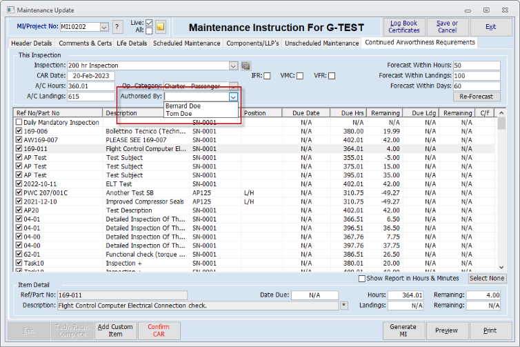 The screen layout is the same as the above with the exception that where there is an associated Line Hangar Project, the CAR screen also has a “Continuing Airworthiness Project” drop-down combo, which allows you to select the associated Base Hangar Project, and this gets printed on the report.