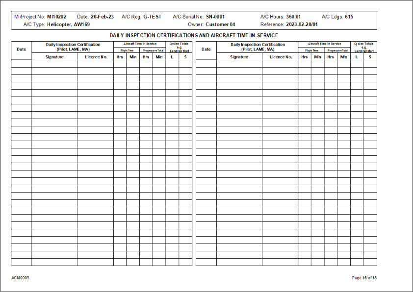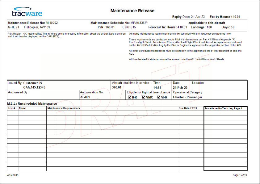 The report can be printed in various formats as set against the relevant A/C Maintenance Type in the Quality Setup.