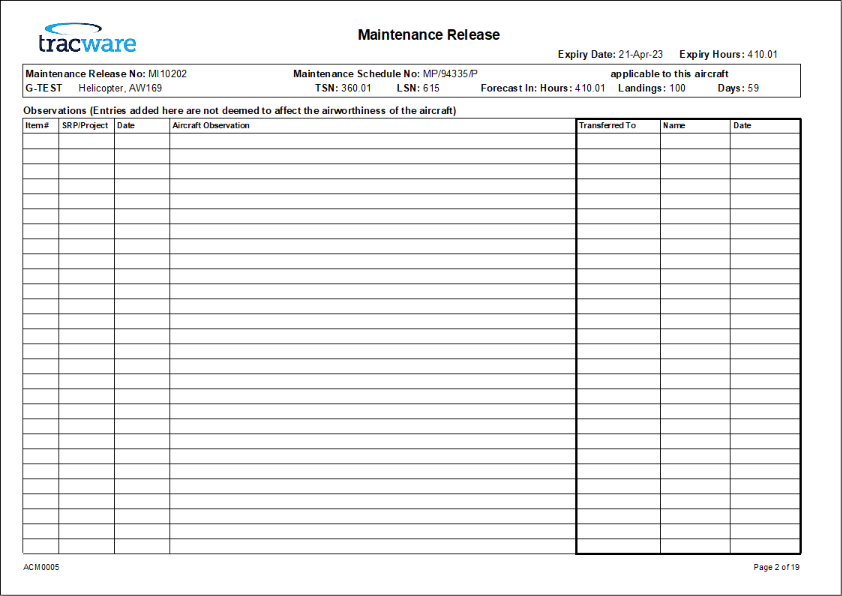 The report format is as shown below, with the additional Recalculated Due Hrs, Due Ldg/Cyc and Due Date columns :-