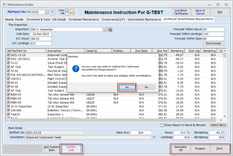 The CAR is confirmed via the "Confirm CAR" button and selecting "Yes" at the next pop-up :-