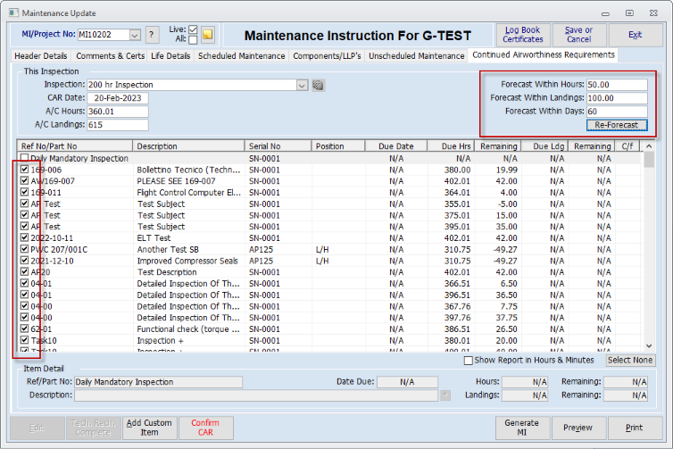 Click the "Re-Forecast" button. The system will run the forecast, based on the criteria set, and automatically select (tick) all the maintenance events due within the period in order to populate the CAR report :-