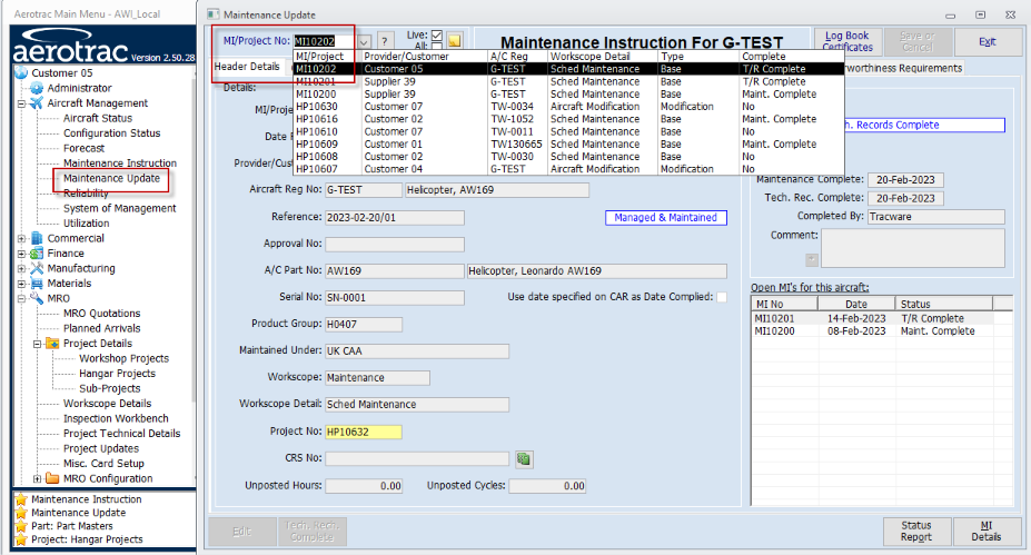 From the Main Menu, of the main Aerotrac application, navigate to Aircraft Management, Maintenance Update and select the relevant Maintenance Instruction number in the drop-down combo located at the top left of the screen :-